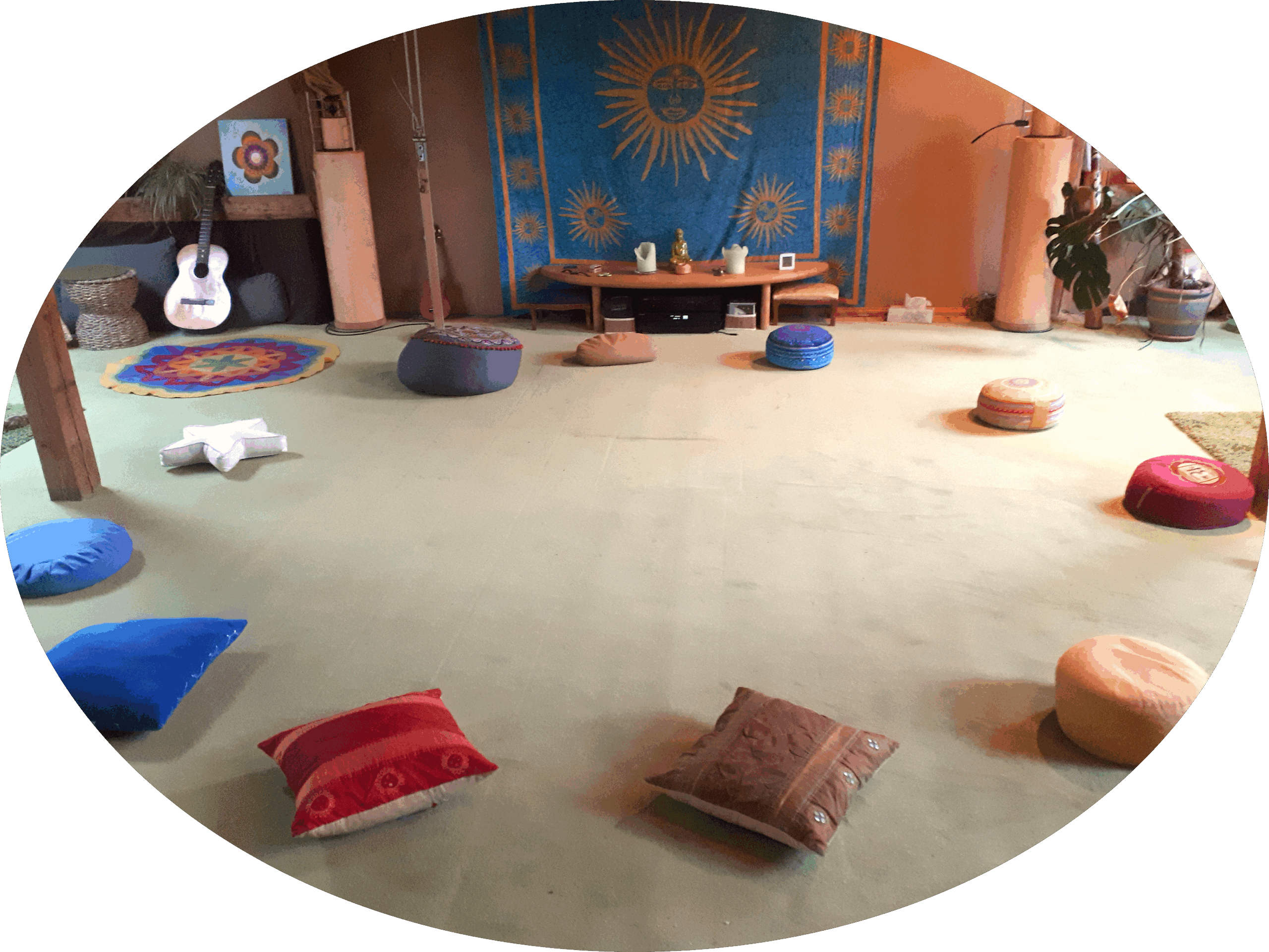 Im Wohnzimmer ist genug Platz, um zusammen zu schütteln, zu meditieren, zu tönen, zu tanzen und Singkreise durchzuführen.
